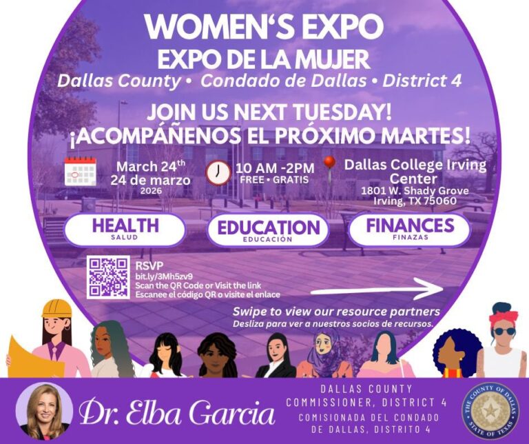 Dr. Elba Garcia, Dallas County commissioner for District 4, will host the Dallas County District 4 Women’s Expo on March 24, 2026. Commissioner Garcia is taking action to support women’s health and well-being by hosting a dynamic community expo designed to inform, inspire, and connect residents with essential resources. Back for its second year, this free community event — dedicated to the health, self-care and personal growth of women and their families — will take place at Dallas College Irving Center from 10 a.m. to 2 p.m.